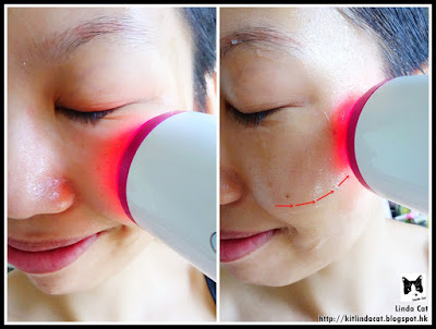 然後把 RF 美顏儀放在面上,透過銀色鍍電感應條,探頭會發出紅光,呢個時候就可以進行提拉,紅光的作用是令肌膚達到幼嫩及顯得緊緻。